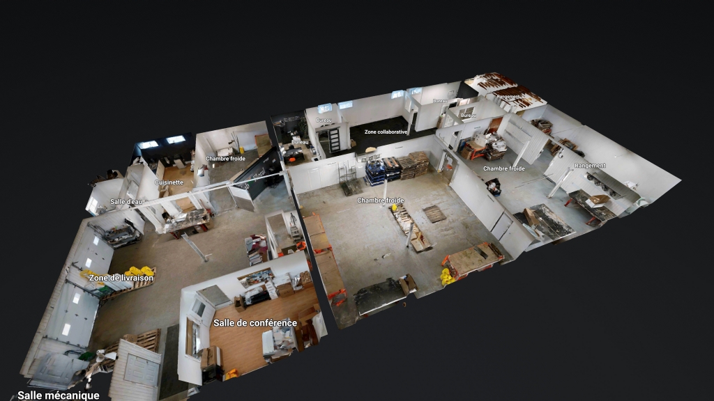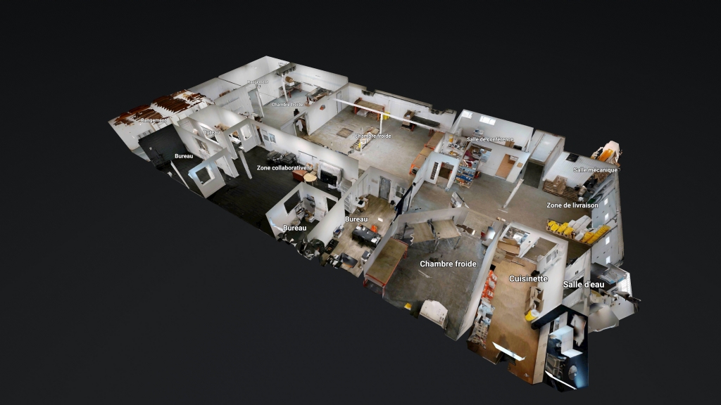 Le local industriel à louer fait environ 6 200 pieds carrés au total. La partie bureau fait environ la moitié du local. Les autres parties, soient les chambres froides, zone de chargement, salle d’eau et cuisinette occupe le reste.