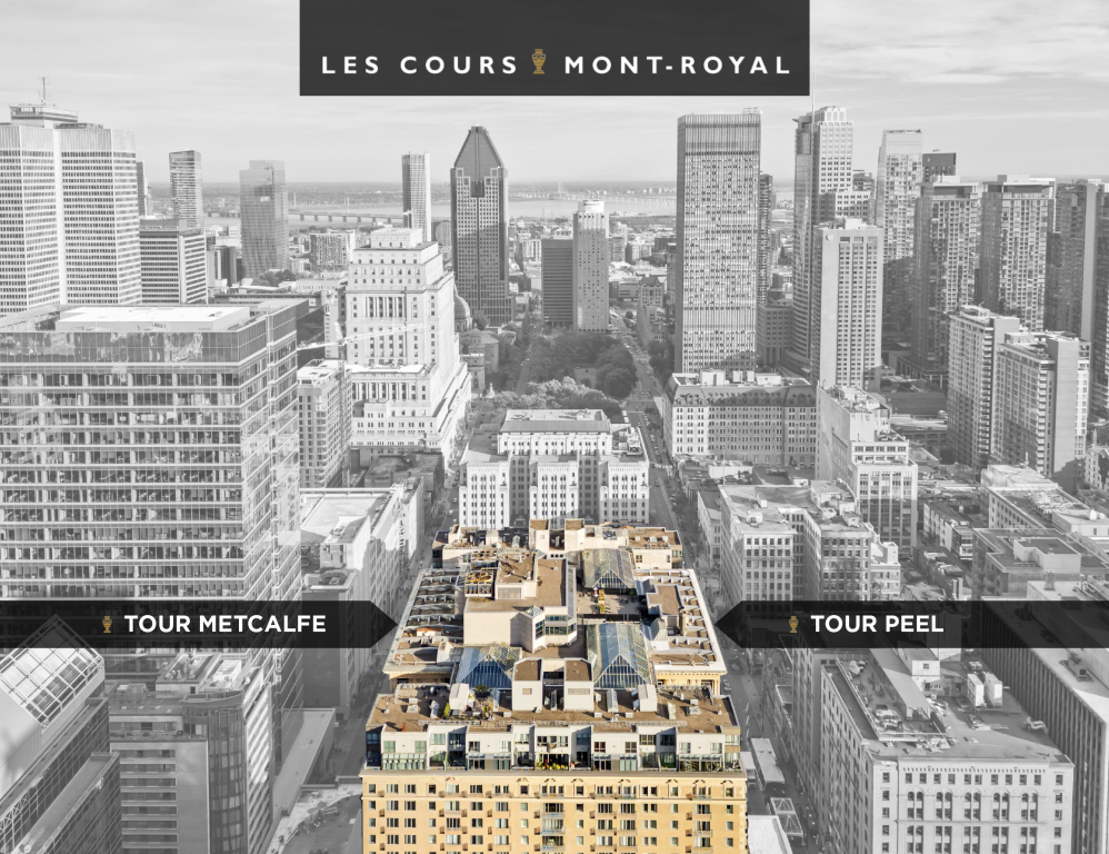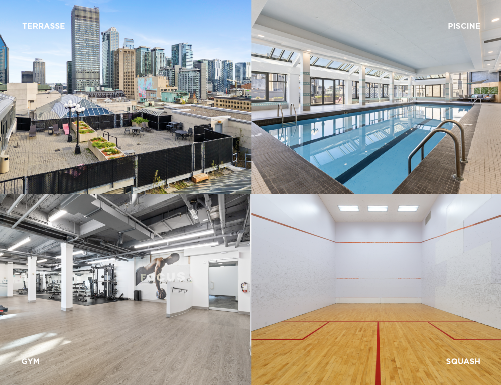 Les occupants bénéficient de commodités haut de gamme, dont une piscine intérieure sur le toit des Cours Mont-Royal, adjacente à une terrasse offrant une vue imprenable sur le centre-ville et le Mont Royal.