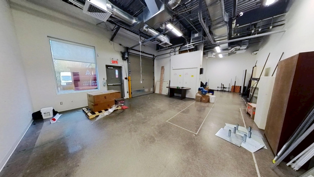 L’entrée du local s’ouvre sur une aire d’accueil moderne, suivie d’un bureau fermé lumineux donnant sur l’extérieur. L’espace central est composé de plusieurs sections cloisonnées pouvant être adaptées selon les besoins du futur locataire. À l’arrière, un espace entrepôt avec porte de garage au sol facilite le transport et la réception de matériel.