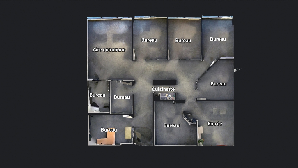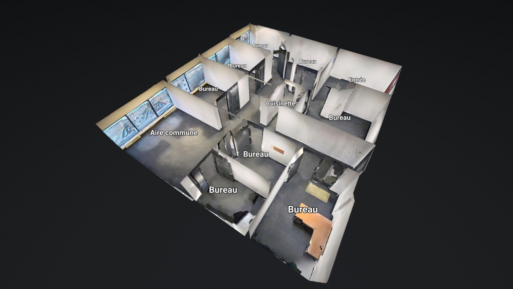D’une superficie d’environ 2 120 p.c., le local se compose d’une grande aire commune, de six bureaux fermés, d’une cuisinette, ainsi que d’un espace d’accueil à l’entrée. L’aménagement favorise la fluidité des déplacements et le confort des occupants, tout en offrant une très belle luminosité naturelle grâce aux immenses fenêtres.