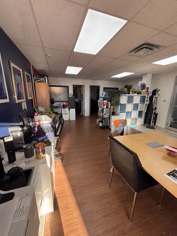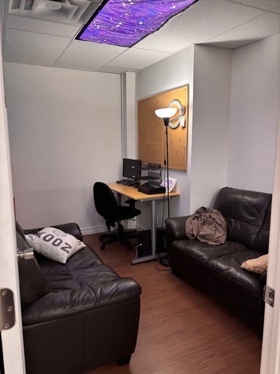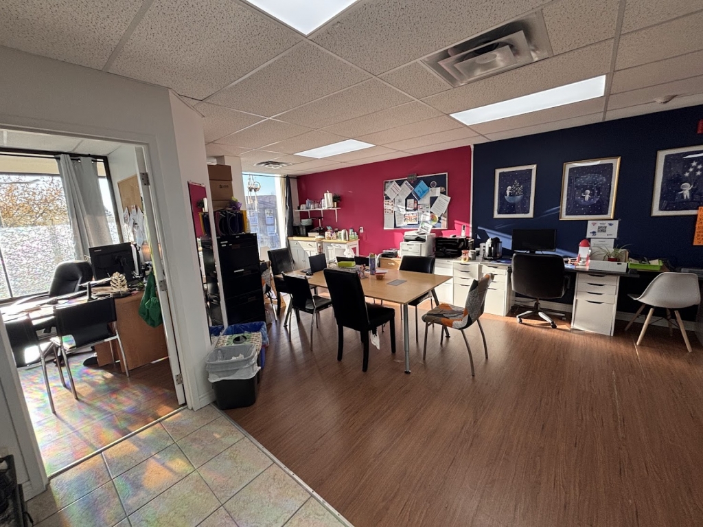 D’une superficie d’environ 883 p.c., le local propose un aménagement ouvert comprenant plusieurs zones de travail, une aire commune conviviale ainsi que des espaces fermés pouvant servir de bureaux privés ou de salles de rencontre. La disposition permet une belle flexibilité d’aménagement selon les besoins de l’entreprise.