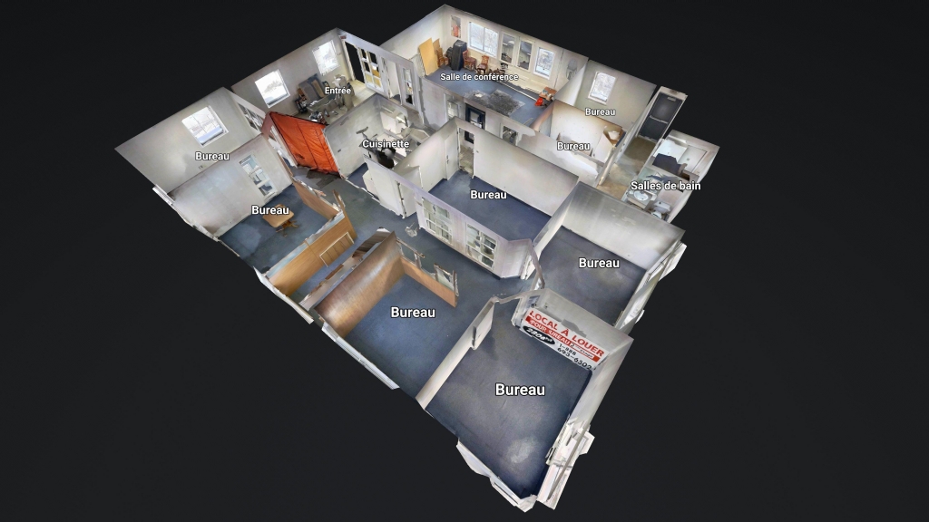 D’une superficie d’environ 2 780 p.c., le local comprend plusieurs bureaux fermés, une salle de conférence, une cuisinette, des salles de bain ainsi qu’un espace d’entrée distinct. La configuration permet une excellente séparation des fonctions, favorisant autant le travail individuel que les rencontres d’équipe.