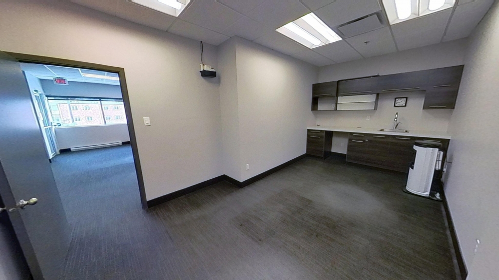 D’une superficie d’environ 1 008 p.c., le local se trouve au rez-de-chaussée et comprend une aire ouverte lumineuse, deux bureaux fermés ainsi qu’une cuisinette intégrée. La configuration permet d’aménager facilement des postes de travail, un espace collaboratif ou une zone d’accueil selon les besoins de l’occupant. Les grandes fenêtres apportent une belle luminosité naturelle et contribuent à créer un milieu de travail agréable.
