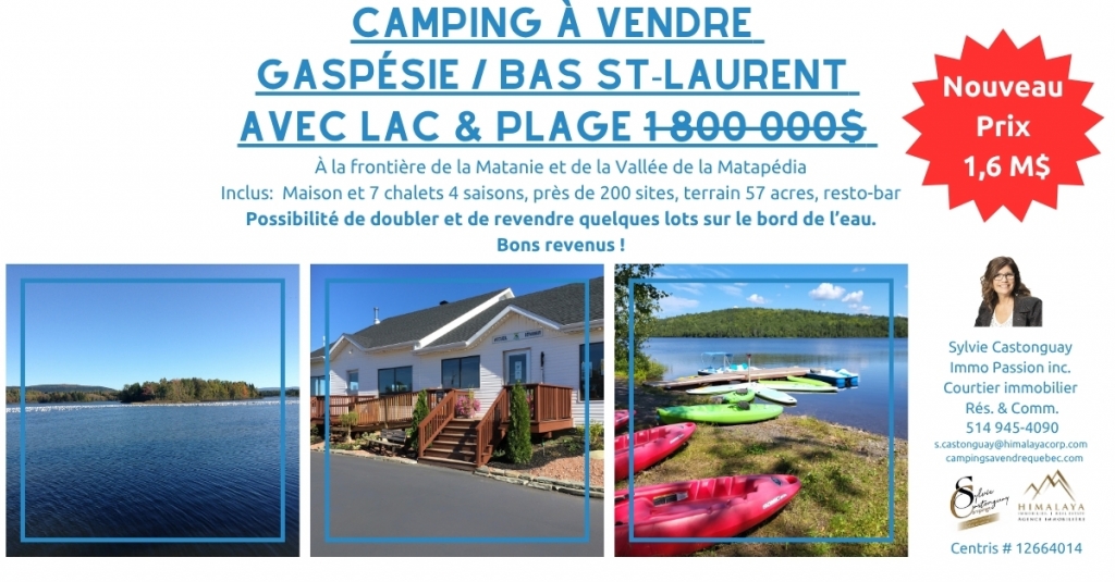 Campground with Outdoor Base and Resort for Sale at the Gateway to Gaspésie (Québec, Canada). Located on the border of Matanie and the Matapédia Valley, very close to New Brunswick, this is a beautiful family campground on the shore of a large navigable lake with enormous expansion potential (up to double the current size).